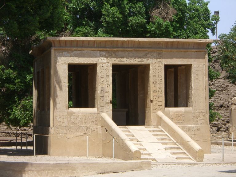 森乌塞特一世门楣,描绘了森乌塞特一世(右中)接受阿蒙神(左中)的祝福,荷鲁斯神(左)和塞特神(右)在一旁注视着他们。