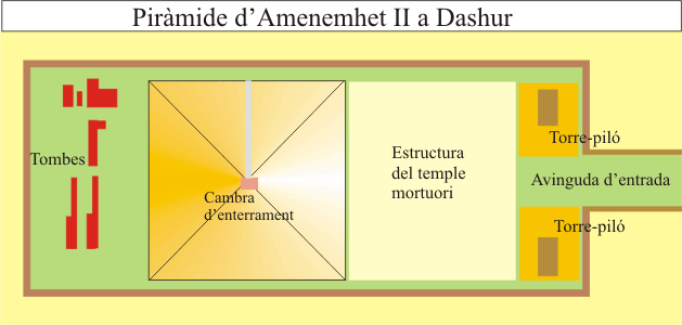 与他的两位前任在利什特(Lisht)建造金字塔不同,阿门内姆哈特二世选择了达舒尔(Dahshur)作为他的陵墓地。自斯奈夫鲁及其红色金字塔(第四王朝)以来,达舒尔就再也没有被用作皇家陵墓。如今,阿门内姆哈特二世的金字塔——最初被称为阿蒙努-塞赫姆(Amenu-sekhem),但如今更为人熟知的名称是白色金字塔——保存状况不佳,发掘程度也很低。