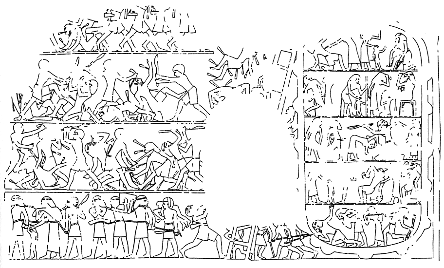 在杰的卡尔统治时期,埃及与其邻国的关系并非全都和平。在一名叫做因蒂的上埃及第二十一诺姆的官员的墓中,发现了已知最早描绘战争或城市围攻的壁画(如左图)。这个壁画描绘了埃及士兵借助梯子攀爬近东堡垒的城墙。古埃及人在古王国后期似乎定期在迦南组织惩罚性袭击,但又未试图在那里建立永久的统治。