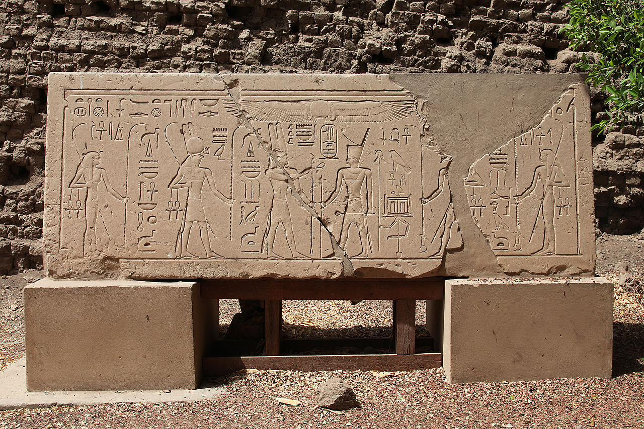 森乌塞特一世门楣,描绘了森乌塞特一世(右中)接受阿蒙神(左中)的祝福,荷鲁斯神(左)和塞特神(右)在一旁注视着他们。